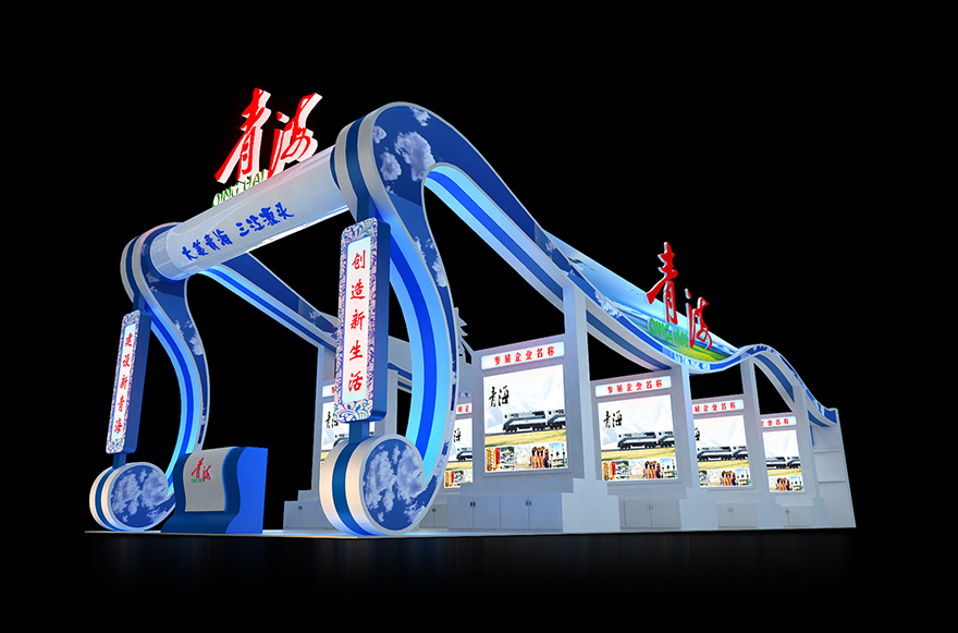 设计风格上以它独特的流顺的卷弧型来造势,使参观者进入展馆带来强烈的视觉震撼,设计概念是来自地云的特性,蓝色的造型中点缀着朵朵白云,特此表明“青海”的海阔天空胸怀。